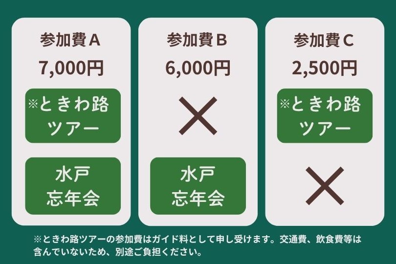 | 定員 | ときわ路ツアー 20名(主催者を含む) 水戸忘年会 15名(主催者を含む) |