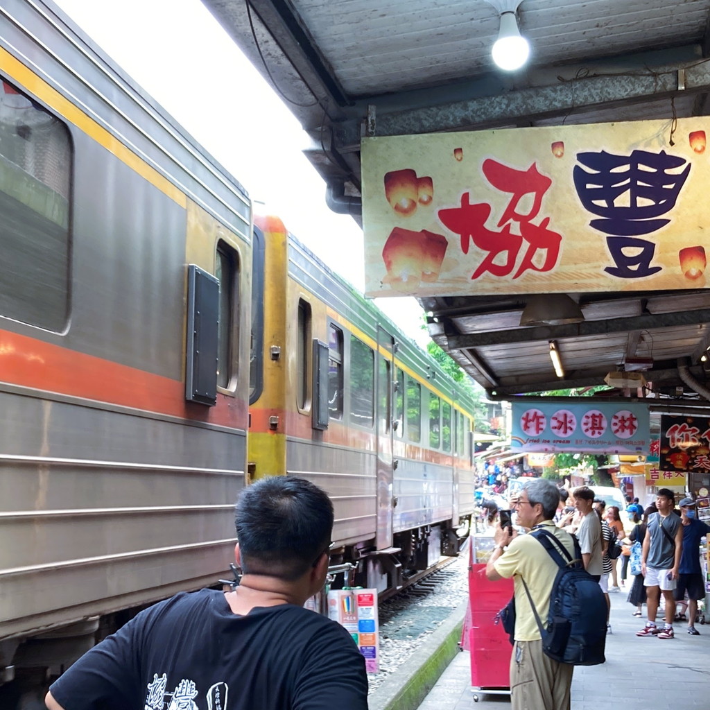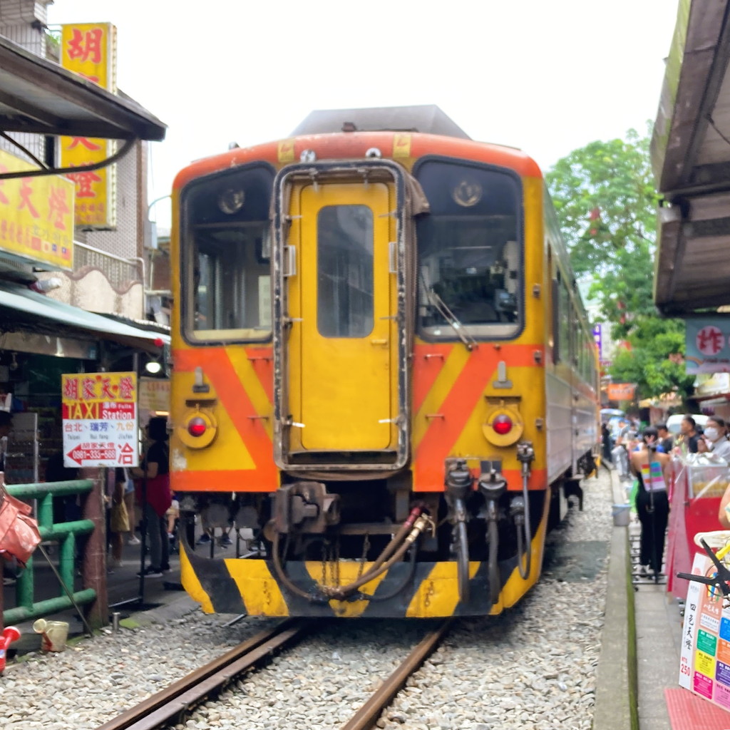 商店の軒先を通過していく列車。ふだんは線路に自由に入ることができ、ここで天燈(ランタン)上げをする観光客でにぎわいます。