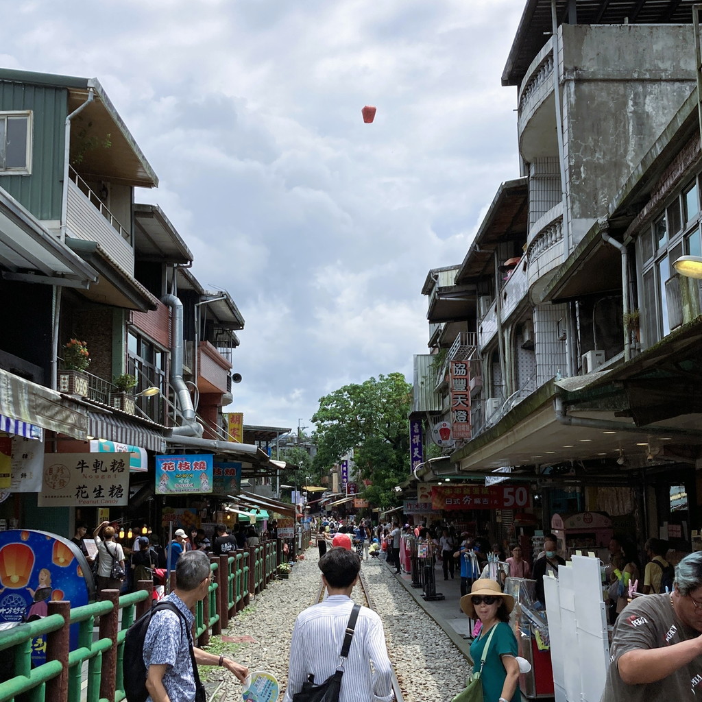 線路沿いギリギリに店が並ぶ老街で、名物のランタン上げを体験できます。