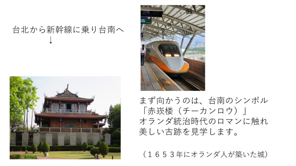 高鐵で台南へ。タクシーで赤崁樓(チーカンロウ)へ向かい、歴史ある街並みを歩きます。